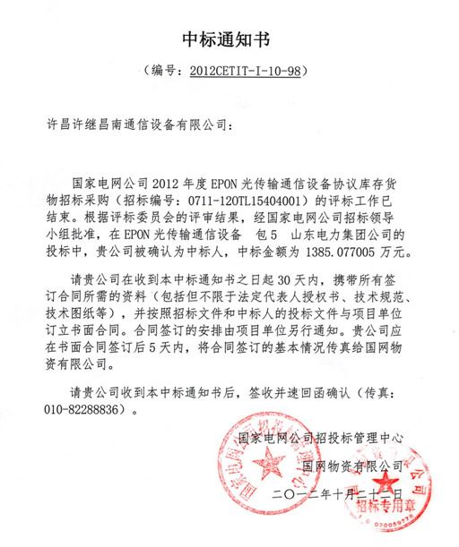 金秋十月傳捷報---EPON國網(wǎng)集招中標(biāo)