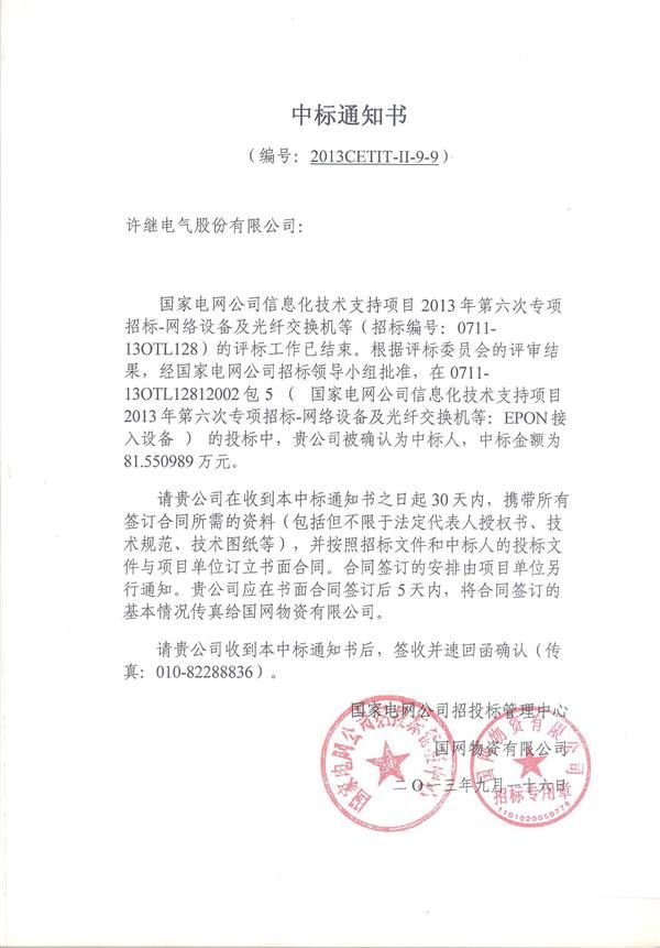 中標(biāo)國家電網(wǎng)公司信息化技術(shù)支持項目2013年第6次專項招標(biāo)江蘇、福建地區(qū)